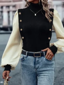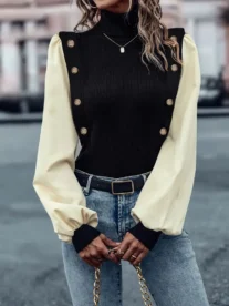Be the first to review “Elegant High-Neck Knit Sweater with Faux Button Detail – Stretchy Polyester Blend, Machine Washable” Cancel reply