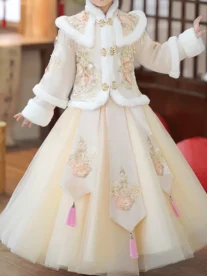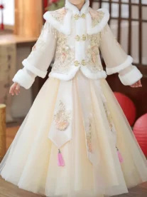 GULULU Elegant Winter Princess Dress for Girls – Polyester and Viscose Blend, Long-Sleeve, Round Neck, Tassel Detail, Umbrella Hem, Woven Fabric, Non-Stretch, Opening Front, Half-Skirt Set, For Outdoor