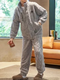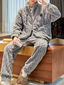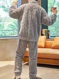 korean 2pcs Set of Teenage Boys’s Flannel Stand-up Collar Zipper Long Sleeve Shirt and Pants Autumn and Winter Warm Sleepwear Set